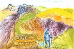 In the distance, around Hotbanks Farm, the beauty of the fields is echoed in inks of soft pale yellows and greens, then the drama returns as the ancient wall suddenly appears and follows the curving contours of a huge hill and inhospitable sunken valley to culminate in the ruins of Milecastle 39-40.